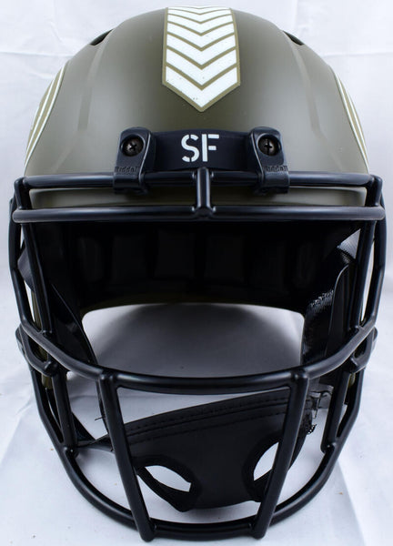 Deion Sanders Autographed San Francisco 49ers F/S Salute to Service Speed Helmet-Beckett W Hologram *Red This is a hand autograph of Deion Sanders of the San Francisco 49ers on a Riddell Football Full Size Salute to Service Speed Replica Helmet. This item has a Beckett Witnessed Authentication, which comes with a numbered hologram and a QR code for verification. You can view this item on the Beckett Authentication website. It was signed either at a public autograph appearance or a private signing. This is a stock photo of the item. Although you may not receive this exact item, the item you receive is virtually identical and brand new in great shape.