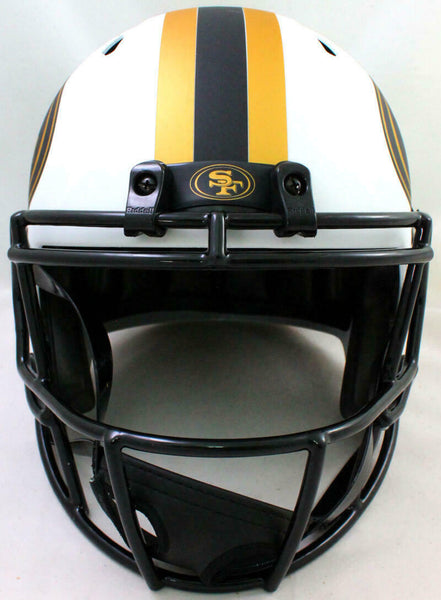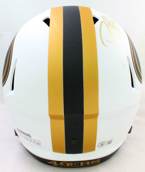 Deion Sanders Signed San Francisco 49ers Lunar Speed F/S Helmet- BA W Holo *Gold This is a Deion Sanders of the San Francisco 49ers hand autographed Riddell Full Size Lunar Speed Replica Helmet. This item has a Beckett Witnessed Authentication, which comes with a Beckett numbered hologram and a generic Beckett Certificate of Authenticity. You can view this item on the Beckett Authentication website and it shows when and where the item was signed. It was signed either at a public autograph appearance or a private signing. This is a stock photo of the item. Although you may not receive this exact item, the item you receive is virtually identical, brand new, and in great shape.