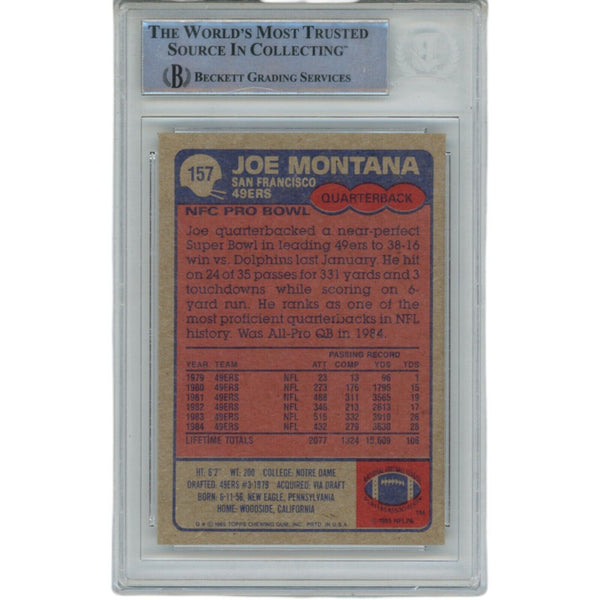 The number in the listing title is just an inventory sku for our records and is not the authentication number. The item pictured is the exact item you will receive, please see photos for condition. This is a San Francisco 49ers 1985 Topps #157 Slabbed Trading Card that was personally autographed by Joe Montana. Includes a certificate of authenticity from Beckett Authentication Services (BAS) and Denver Autographs.FREE SHIPPING within the USA on orders over $10!
