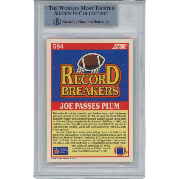 The number in the listing title is just an inventory sku for our records and is not the authentication number. The item pictured is the exact item you will receive, please see photos for condition. This is a San Francisco 49ers 1990 Score #594 Slabbed Trading Card that was personally autographed by Joe Montana. Includes a certificate of authenticity from Beckett Authentication Services (BAS) and Denver Autographs.FREE SHIPPING within the USA on orders over $10!