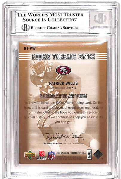 Patrick Willis Signed 2007 SP Threads Gold Patch Card Beckett 38722 The number in the listing title is just an inventory sku for our records and is not the authentication number. The item pictured is the exact item you will receive so see photos for condition. This is a slabbed 2007 SP Threads Gold Patch Trading Card that was personally autographed by Patrick Willis. Includes a certificate of authenticity from Beckett Authentication Services (BAS) and Denver Autographs.