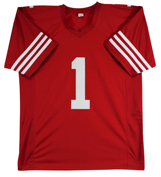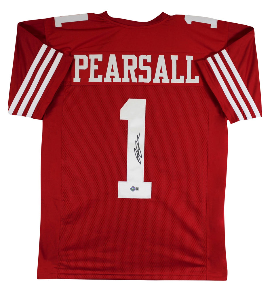 This Autographed Red Pro Style Jersey has been Personally Signed by Ricky Pearsall of the San Francisco 49ers. This item is 100% Authentic to include a hologram by Beckett Authentication Services. This item will come with an affixed Beckett Authentication Services (BAS) authentication sticker, which includes a scannable QR code to verify authenticity. Please note that Beckett no longer provides serial-numbered COA cards, and the attached BAS sticker will serve as the complete authentication for this item. This is a BAS Witnessed Protection Program item which means a Beckett Authentication Service representative was present when this item was being signed. We conducted an autograph signing with Ricky Pearsall where multiples of the same item were signed. While the photographs are representative of this item, the size, placement and strength of the signature may vary. Each item is hand signed, therefore, each autograph is unique. This item can be verified through BAS Witnessed. This is a X-Large sized, non-branded, custom-stitched Jersey.
