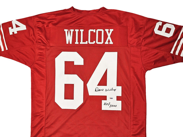 This is a Red Jersey that has been hand signed by Dave Wilcox. This is a custom jersey with no name brand. The approximate size is XL. It has nice sewn in name and numbers. This item was inscribed "HOF 2000." This item has been certified authentic by PSA/DNA and comes with their tamper-proof sticker and matching certificate of authenticity.