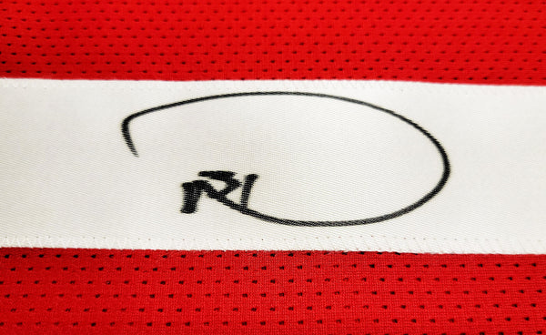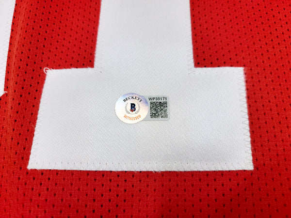 This is a Red Jersey that has been hand signed by Donte Whitner. This is a custom jersey with no name brand. The approximate size is XL. It has nice sewn in name and numbers. This item has been certified authentic by Beckett Authentication (BAS) and comes with their tamper-proof QR Code sticker that can be verified on the Beckett-authentication.com.