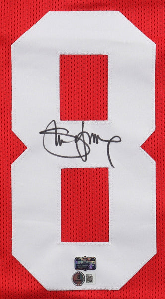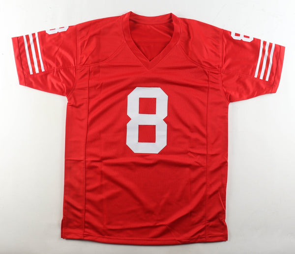 Custom on-field style jersey. Everything sewn on, size XL. Hand-signed by Steve Young.The autograph includes an official Beckett Authentication Services serially numbered hologram and QR Code Card for authenticity purposes. The signing of this item was witnessed by Beckett.Authentication: Beckett Hologram & QR Code Card