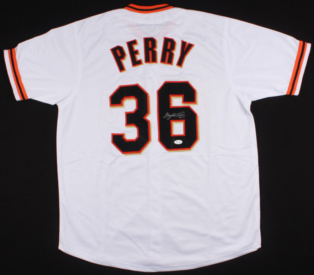 Custom on-field style jersey. Everything is sewn on, size XL. Jersey has been hand-signed in silver paint pen by Gaylord Perry (HOF). The lot / autograph(s) includes an official James Spence Authentication (JSA) hologram and matching COA for authenticity purposes. The signing of this item was witnessed by JSA.Authentication: JSA COA