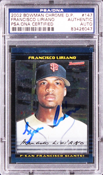 This Autographed 2002 Bowman Chrome #147 Rookie Card has been Personally Signed by Francisco Liriano of the San Francisco Giants. This item is 100% Authentic, it comes slabbed and authenticated by PSA/DNA. The authenticity can be verified on Professional Sports Authenticator website.