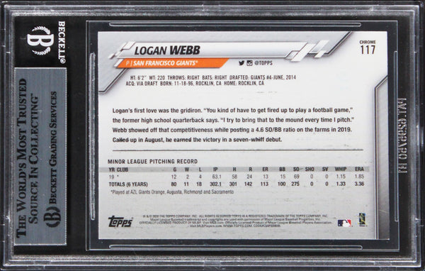 This Autographed 2020 Topps Chrome #117 Card has been Personally Signed by Logan Webb of the San Francisco Giants. This item is 100% Authentic, it comes slabbed and authenticated by Beckett Authentication Services. We have multiples of this same item. While the photographs are representative of this item, the size, placement and strength of the signature may vary. Each item is hand signed, therefore, each autograph is unique.