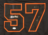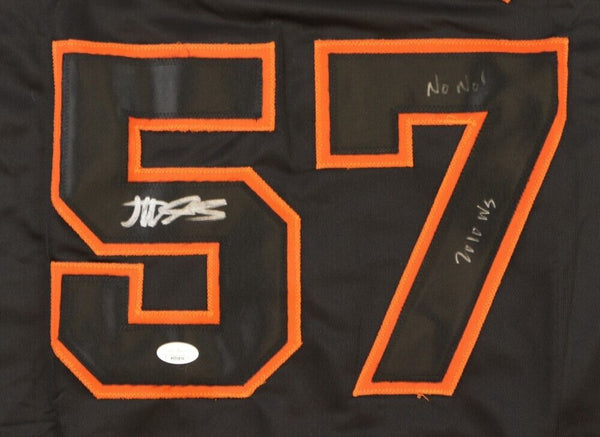 Custom on-field style jersey. Everything is sewn on, size XL. Hand-signed and inscribed by Jonathan Sanchez. (Pitched a No-Hitter 7/10/2009 & Pitched in the 2010 World Series)The lot / autograph(s) includes an official James Spence Authentication (JSA) hologram for authenticity purposes.Authentication: JSA Hologram