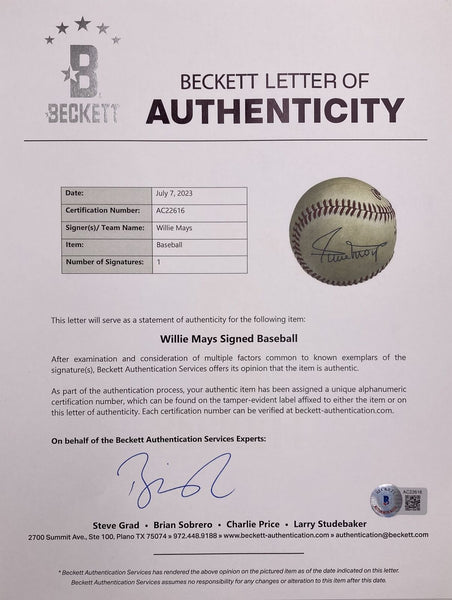 Featured is a Willie Mays signed official 1983 MLB All Star Game baseball. This ball has been hand signed by Mays and comes with the Beckett hologram and letter of authenticity. This ball would make a great addition to any sports memorabilia collection!. SPECIFICATIONS Autographed By: Willie Mays Team: San Francisco Giants Sport: Baseball Authentication: Beckett Grading Services