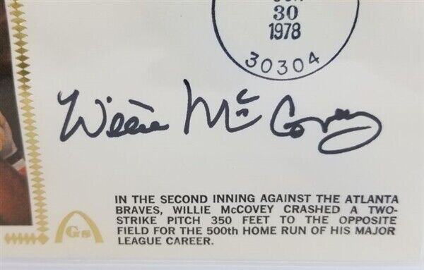 This autographed cachet envelope has been personally hand-signed by Willie McCovey of the San Francisco Giants. This autograph is certified by PSA (Professional Sports Authenticators). It comes encapsulated and authenticated by PSA in the plastic case. PSA has graded the autograph as Gem Mint 10!Willie was a fearsome left-handed power hitter, at the time of his retirement in 1980, McCovey ranked second only to Babe Ruth in career home runs among left-handed batters, and seventh overall. As of 2022, he ranks 20th overall on baseball's all-time home run list, tied with Ted Williams and Frank Thoams. He was a six-time All Star, three-time Home Run Champion, and National League MVP in 1969 and was inducted into the Baseball Hall of Fame in 1986 in his first year of eligibility, only the 16th man so honored, at the time.McCovey died at the age of 80 on October 31, 2018, after battling "ongoing health issues". He had been hospitalized for an infection late the previous week. His longtime friend and fellow Hall of Famer Joe Morgan was at his bedside. A public memorial service for McCovey was held at AT&T Park on November 8, 2018.