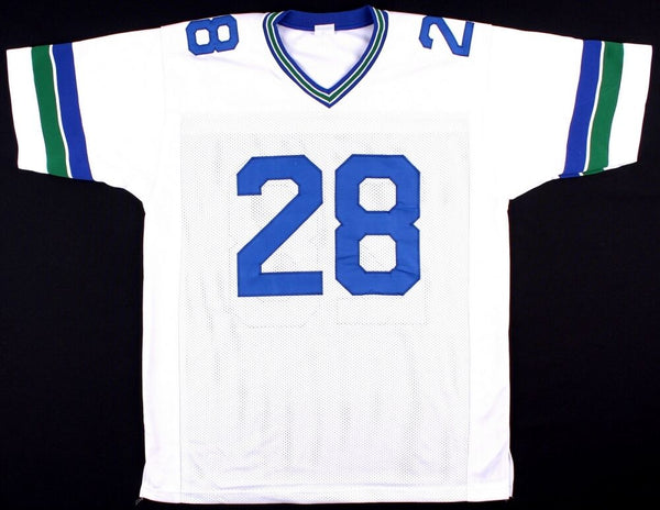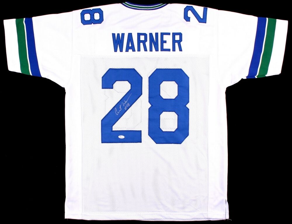 Custom on-field style jersey. Everything is sewn on, size XL. Hand-signed in silver paint pen by Curt Warner. The autograph includes an official James Spence Authentication (JSA) hologram and matching COA for authenticity purposes. The signing of this item was witnessed by JSA.Authentication: JSA COA