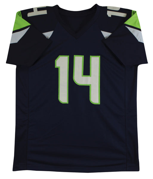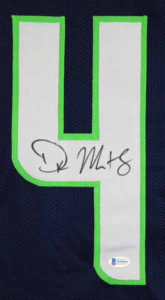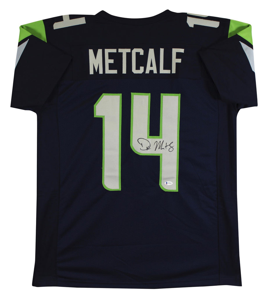 This Autographed Navy Blue Pro Style Jersey has been Personally Signed by D.K. Metcalf of the Seattle Seahawks. This item is 100% Authentic to include a Certificate of Authenticity (COA) / hologram by Beckett Authentication Services. The authenticity can be verified on Beckett Authentication Services website. This is a X-Large sized, non-branded, custom-stitched Jersey. This jersey has the old Beckett hologram and matching COA card. The sticker is slightly loose on the jersey, as it is the older style of Beckett hologram.