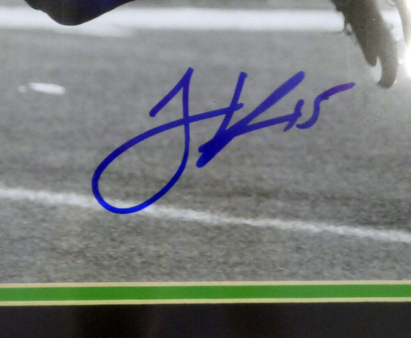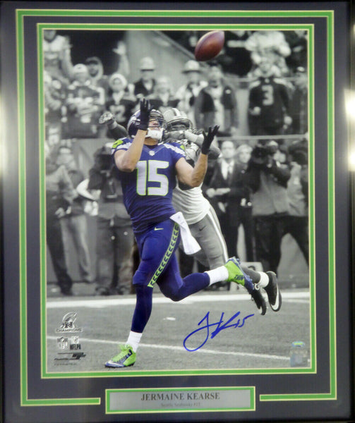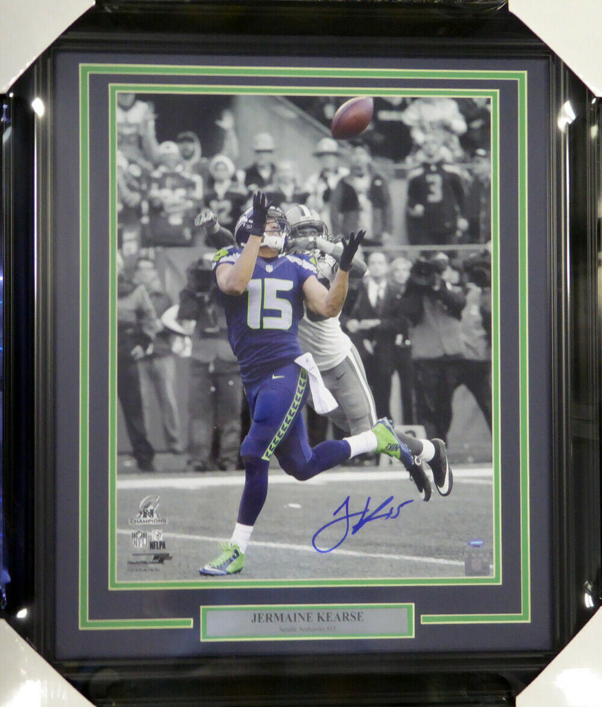 This is a framed 16x20, approximately 24x28 with the frame,that has been hand signed by Jermaine Kearse. It comes with the tamper-proof Mill Creek Sports hologram and matching certificate of authenticity.