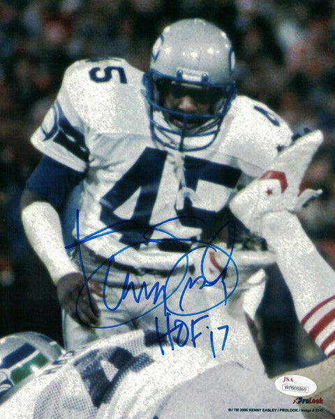Kenny Easley Autographed Seattle Seahawks 8x10 Photo Close Up HOF JSA 19996 This is an officially licensed 8x10 photo that was personally autographed by Kenny Easley with HOF 17 inscription. A sensational strong safety for 7 NFL seasons, being inducted into the Seahawks Ring of Honor and the 35th Anniversary Team. He was a part of 5 Pro Bowls, 4 First-Team All-Pro and was named NFL Defensive Player of the Year in 1984. This item also includes a certificate of authenticity from James Spence Authentication (JSA) and Denver Autographs.