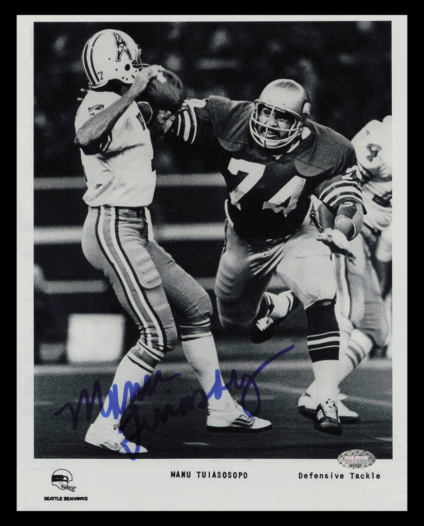 This is an 8x10 Photo that has been hand signed by Manu Tuiasosopo. This item was signed in the presence of a Mill Creek Sports representative and comes with their serial numbered hologram and matching certificate of authenticity.