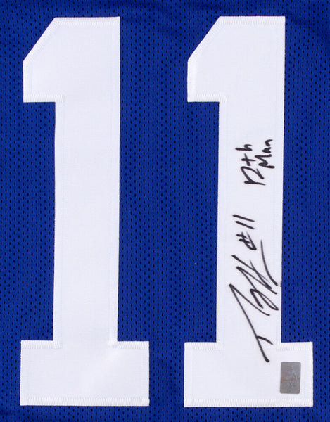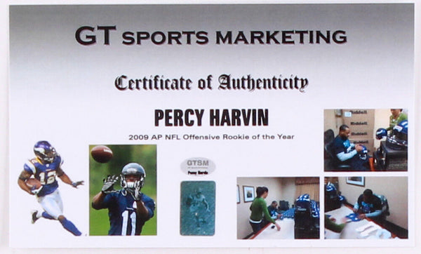 Custom on-field style jersey. Everything is sewn on, size XL. Hand-signed and inscribed in black felt-tip pen by Percy Harvin.The lot / autograph(s) includes an official Percy Harvin player hologram and matching COA from GT Sports Marketing for authenticity purposes. Authentication: GTSM COA & Percy Harvin Hologram