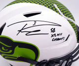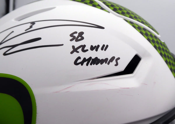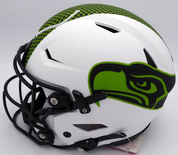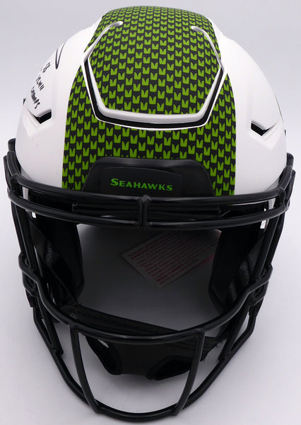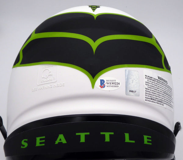 This is a Seattle Seahawks Full Size White Lunar Eclipse Authentic Hyper Speed Flex Helmet that has been hand signed by Russell Wilson. This item has the official tamper-proof Russell Wilson serial numbered hologram and matching certificate of authenticity. A It has also been authenticated with the Beckett Witness certification, meaning both a representative from Beckett and Mill Creek Sports witnessed the signing.A It also comes with their sticker and matching certificate of authenticity.A NOTE: The Eclipse helmets are very delicate and often have some marks or scratches on them.A **This one has a red scuff on it, near the autograph, as shown in the pictures.