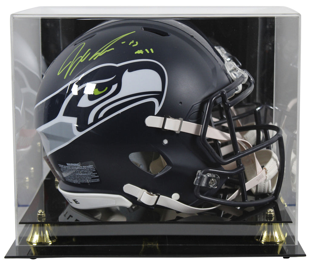This Autographed Full Size Speed Proline Helmet W/ Uv Mirrored Back Acrylic Display Case has been Personally Signed by Jaxon Smith-Njigba of the Seattle Seahawks. This item is 100% Authentic to includes a numbered hologram by Fanatics. We conducted an autograph signing with Jaxon Smith-Njigba where multiples of the same item were signed. While the photographs are representative of this item, the size, placement and strength of the signature may vary. Each item is hand signed, therefore, each autograph is unique. This item can be verified through Fanatics.