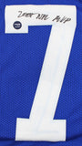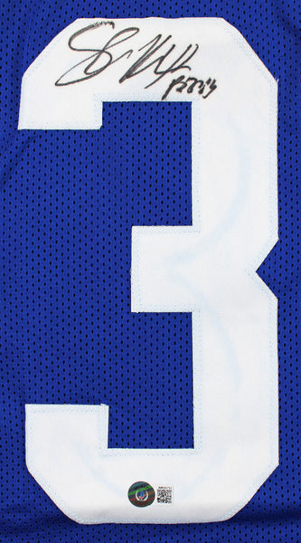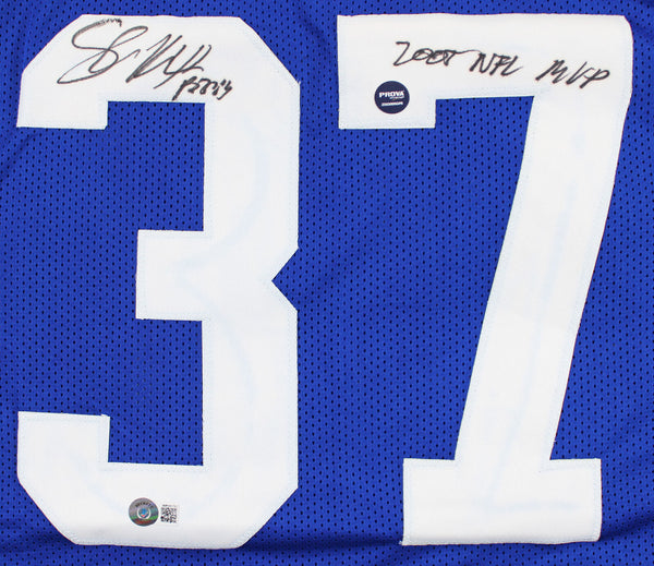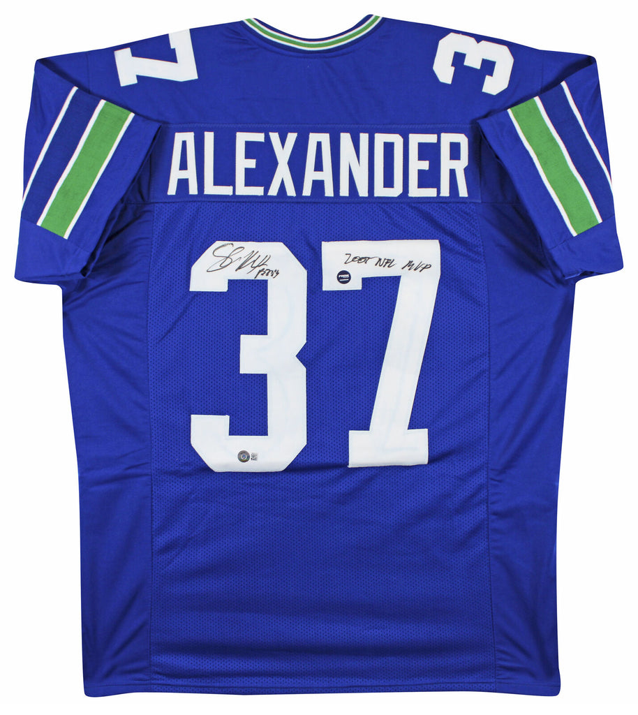 This Autographed Blue Pro Style Jersey with the inscription of "2005 NFL MVP" has been Personally Signed by Shaun Alexander of the Seattle Seahawks. This item is 100% Authentic to include a hologram by Beckett Authentication Services. This item will come with the new Beckett Authentication hologram that has a scannable QR code rather than the traditional COA. If you would like to have a COA, you are welcome to reach out to Beckett for a printed certification once you receive your item. This is a BAS Witnessed Protection Program item which means a Beckett Authentication Service representative was present when this item was being signed. The authenticity can be verified on Beckett Authentication Services website. This is a X-Large sized, non-branded, custom-stitched Jersey.