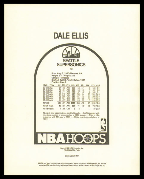 This is an 8x10 Photo that has been hand signed by Dale Ellis. This item is guaranteed to pass any third party authentication company including Beckett, PSA/DNA, & JSA authentication.