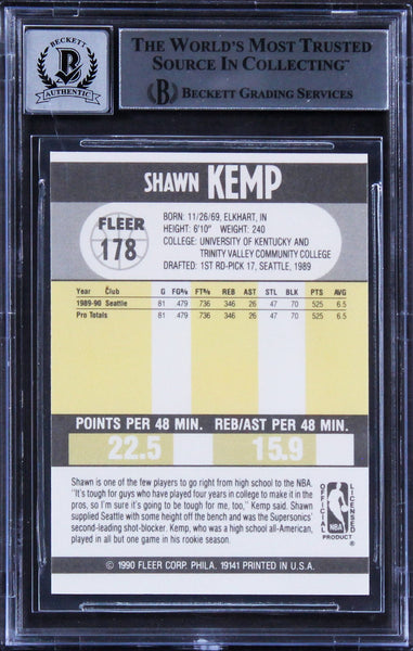 This Autographed Auto Graded Gem Mint 10! 1990 Fleer #178 Rookie Card has been Personally Signed by Shawn Kemp of the Seattle Supersonics. This item is 100% Authentic, it comes slabbed and authenticated by Beckett Authentication Services. We conducted an autograph signing with Shawn Kemp where multiples of the same item were signed. While the photographs are representative of this item, the size, placement and strength of the signature may vary. Each item is hand signed, therefore, each autograph is unique. This item can be verified through BAS Slabbed.