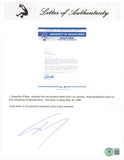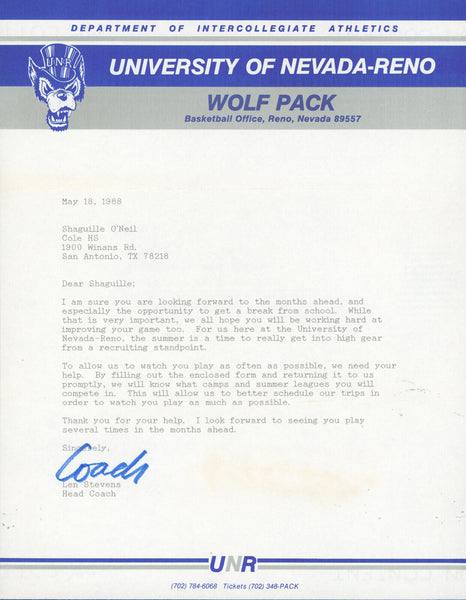 This is a 1988 University of Nevada-Reno Shaquille O'Neal Recruitment Letter has been written to Shaquille O'Neal. This recruitment letter was signed by Len Stevens, the Head Basketball Coach of University of Nevada-Reno. Stevens' signature is not authenticated. This recruitment letter will come with a Letter of Authenticity from Shaquille O'Neal, which has been signed in the presence of a Beckett representative. This letter will come with its original envelope. This letter was was kept in Shaquille O'Neal's personal collection since it was received.