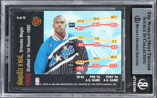 This Autographed 1994 Stadium Club Rising Stars #5 Card has been Personally Signed by Shaquille O'Neal of the Los Angeles Lakers. This item is 100% Authentic, it comes slabbed and authenticated by Beckett Authentication Services. The authenticity can be verified on Beckett Authentication Services website.