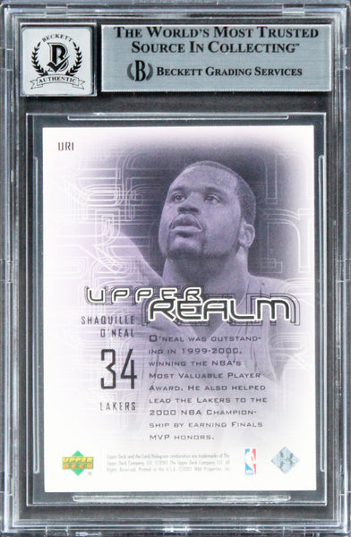 This Autographed Auto Graded Gem Mint 10! 2000 Upper Deck Encore Upper Realm #UR1 Card has been Personally Signed by Shaquille O'Neal of the Los Angeles Lakers. This item is 100% Authentic, it comes slabbed and authenticated by Beckett Authentication Services. We have multiples of this same item. While the photographs are representative of this item, the size and placement of the signature may vary. Each item is hand signed, therefore, each autograph is unique.
