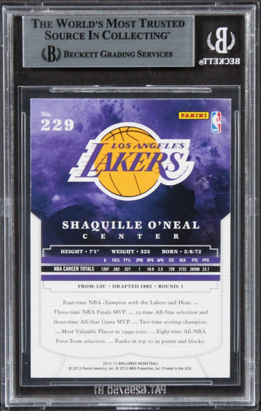 This Autographed 2012 Panini Brilliance #229 Card has been Personally Signed by Shaquille O'Neal of the Los Angeles Lakers. This item is 100% Authentic, it comes slabbed and authenticated by Beckett Authentication Services. We have multiples of this same item. While the photographs are representative of this item, the size, placement and strength of the signature may vary. Each item is hand signed, therefore, each autograph is unique.