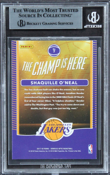 This Autographed 2017 Donruss Optic The Champ Is Here #7 Card has been Personally Signed by Shaquille O'Neal of the Los Angeles Lakers. This item is 100% Authentic, it comes slabbed and authenticated by Beckett Authentication Services. We have multiples of this same item. While the photographs are representative of this item, the size, placement and strength of the signature may vary. Each item is hand signed, therefore, each autograph is unique.