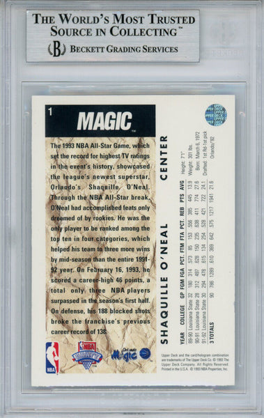 Shaquille O'Neal Autographed 1992 Upper Deck #1 Rookie Card Beckett Slab 33854 The number in the listing title is just an inventory sku for our records and is not the authentication number. The item pictured is a stock photo unless otherwise noted. This is a trading card that was personally autographed by Shaquille O'Neal. This has been professionally slabbed by Beckett Authentication Services (BAS) and includes a certificate of authenticity from Denver Autographs.