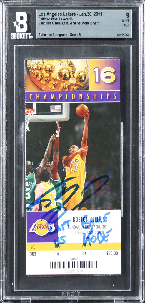 This Autographed Ticket Graded EX-MT 9, Auto Graded Mint 9! January 30, 2011 Celtics Vs. Lakers Ticket Stub with the inscription of "Last Game Vs Kobe" has been Personally Signed by Shaquille O'Neal of the Boston Celtics. This item is 100% Authentic, it comes slabbed and authenticated by Beckett Authentication Services. The authenticity can be verified on Beckett Authentication Services website.