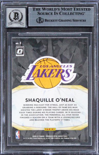 This Autographed Auto Graded Gem Mint 10! 2020 Donruss Optic Winner Stays #1 Card has been Personally Signed by Shaquille O'Neal of the Los Angeles Lakers. This item is 100% Authentic, it comes slabbed and authenticated by Beckett Authentication Services. We have multiples of this same item. While the photographs are representative of this item, the size, placement and strength of the signature may vary. Each item is hand signed, therefore, each autograph is unique.