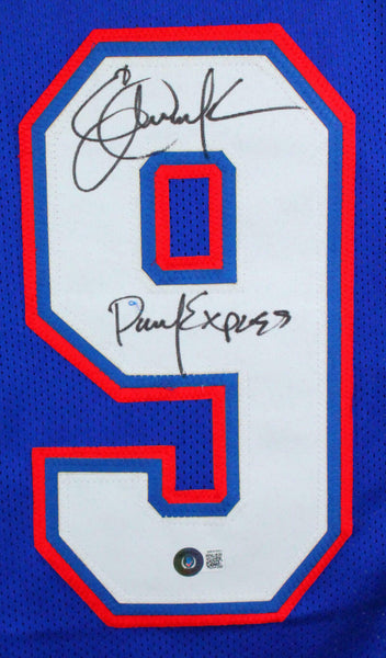 Eric Dickerson Autographed Blue College Style Jersey w/ Pony Express - Beckett W Hologram THIS IS NOT AN NCAA JERSEY. THIS HAS NO TAGS, NO LOGOS, NO EMBLEMS. This is a hand autograph of Eric Dickerson on a Custom Made (non name brand) Authentic Style Jersey with stitched letters and numbers. Inscribed Pony Express. This item has a Beckett Witnessed Authentication, which comes with a numbered hologram and a generic Beckett Certificate of Authenticity. You can view this item on the Beckett Authentication website, it shows when and where the item was signed. It was signed either at a public autograph appearance or a private signing. This is a stock photo of the item. Although you may not receive this exact item, the item you receive is virtually identical and brand new in great shape. Jersey size is XL.