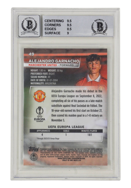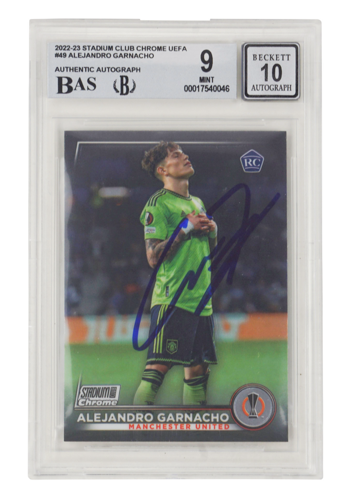 This is a Alejandro Garnacho Signed 2022 Topps Stadium Club Chrome RC - BGS 9 AUTO 10. THE ITEM IN THE PICTURE IS A STOCK IMAGE. YOU WILL RECEIVE AN IDENTICAL ITEM OF EQUAL QUALITY. ALL JERSEYS ARE SIZE LARGE. Every item of signed memorabilia we sell is official and of the highest quality. We pride ourselves on providing sports fans with the most exclusive signed memorabilia on the market. We are an industry leading signed memorabilia company who can guarantee 100% authenticity on every signature we sell. The item you receive will be identical to the one you are seeing in the stock pictures. This includes the item, the authentication company, signature color and signature placement. We take pride in ensuring the authenticity of all our items. With unwavering commitment, we guarantee that every signature is 100% authentic. Every item of signed memorabilia comes with a scannable barcode which takes you to the certificate of authenticity on the company's website. These industry leading authentication companies include Beckett Authentication Services, James Spencer Authentication Services and Professional Sports Authentication Services.