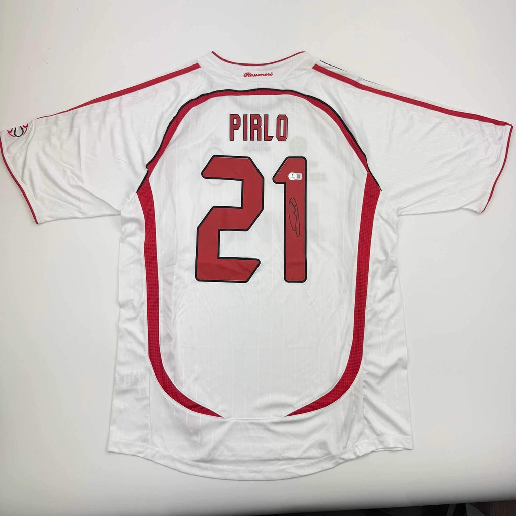 Autographed/Signed Andrea Pirlo AC Milan White Soccer Futbol Jersey Beckett COA Jersey has no brand names or logos. This is a custom jersey and was not manufactured by or in any manner associated with any professional sports league or manufacturer. This custom jersey carries no professional sports league designation. The item is intended to be an autographed collectible. The custom jersey displays the name and number of the player. This item in no way is affiliated with or connected to any professional sports organization. Size is XL.