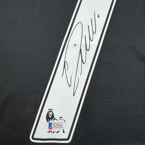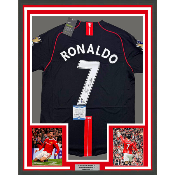 Framed Autographed/Signed Cristiano Ronaldo 35x39 ManU Black Jersey BAS COA #2 The item is professionally framed and matted with two 5x7 photos, measures 35x39 inches and is ready to be hung in your man cave! Photo and matting requests can be made.