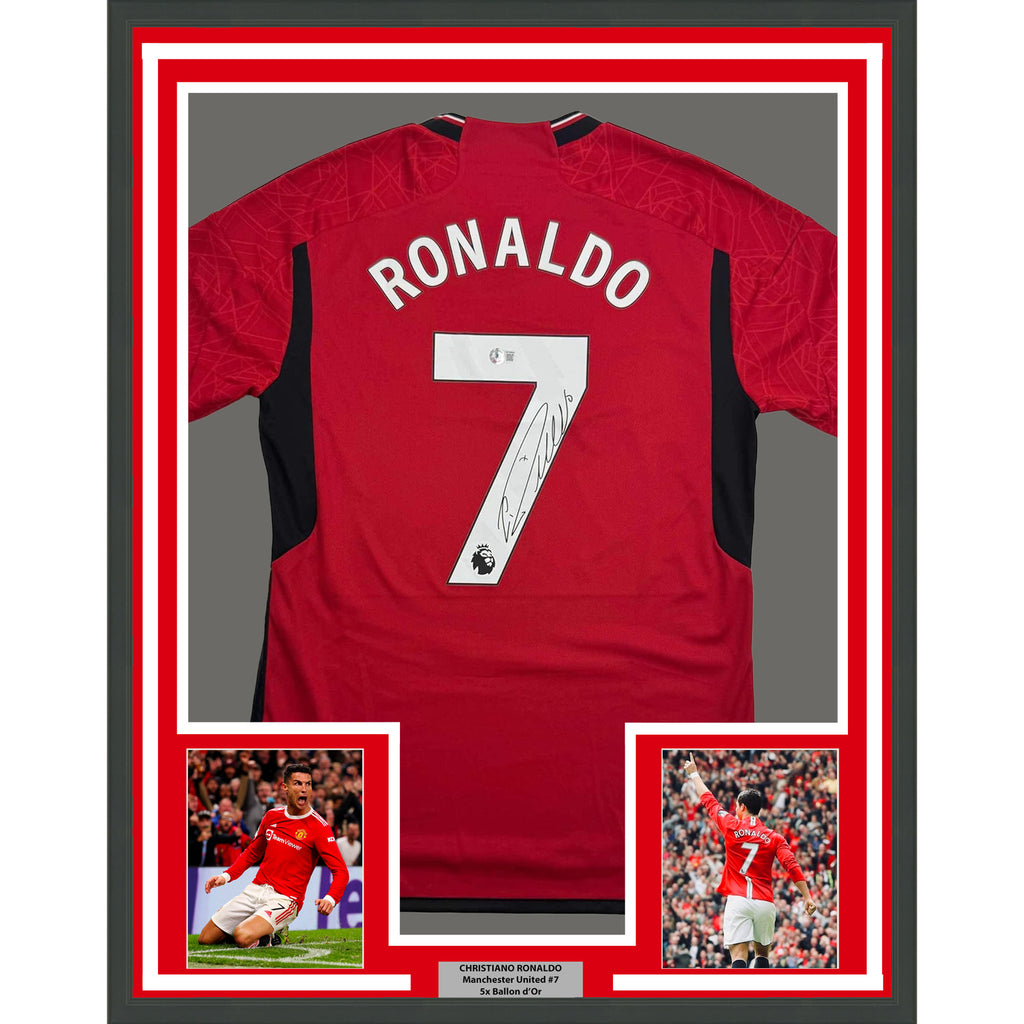 Framed Autographed/Signed Cristiano Ronaldo 35x39 ManU Jersey Beckett BAS COA The item is professionally framed and matted with two 5x7 photos, measures 35x39 inches and is ready to be hung in your man cave! Photo and matting requests can be made.