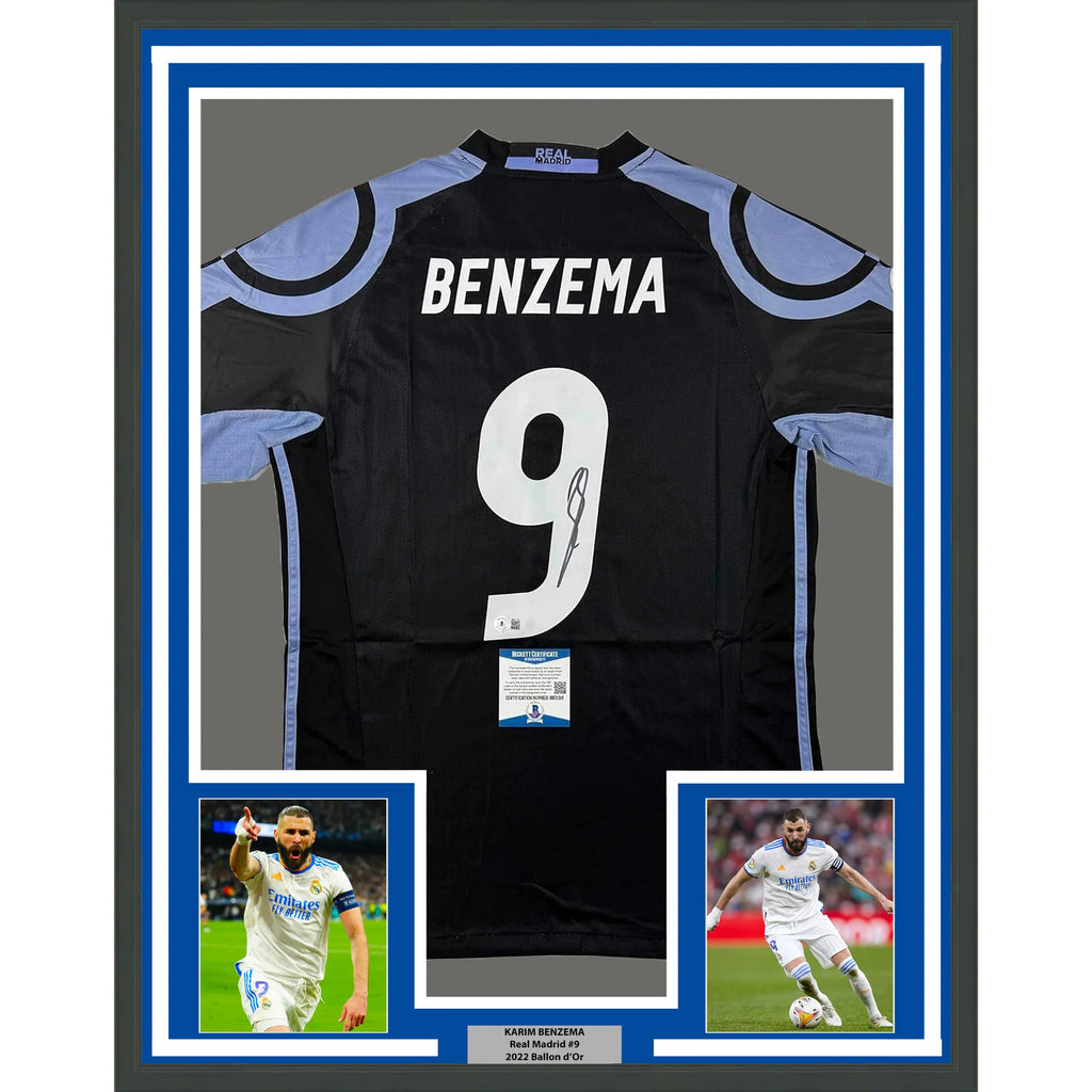 Framed Autographed/Signed Karim Benzema 33x42 Real Madrid 2016-17 Jersey BAS COA The item is professionally framed and matted with two 5x7 photos, measures 35 inches by 39 inches and is ready to be hung in your man cave! Photo and matting requests can be made.