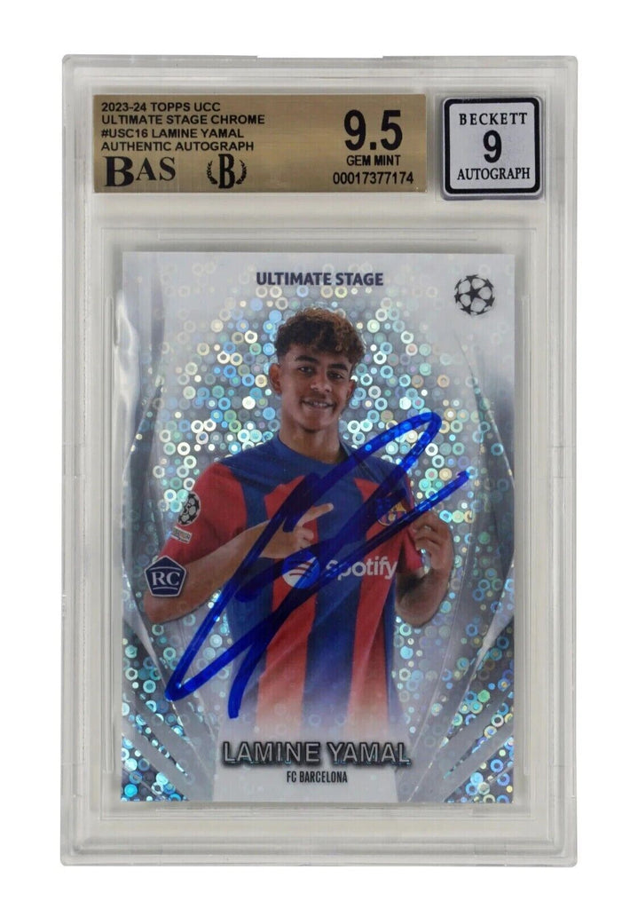 This is a Lamine Yamal Signed 2023-24 Topps Chrome Ultimate Stage Rookie - BGS 9.5 Auto 10. THE ITEM IN THE PICTURE IS A STOCK IMAGE. YOU WILL RECEIVE AN IDENTICAL ITEM OF EQUAL QUALITY. ALL JERSEYS ARE SIZE LARGE. Every item of signed memorabilia we sell is official and of the highest quality. We pride ourselves on providing sports fans with the most exclusive signed memorabilia on the market. We are an industry leading signed memorabilia company who can guarantee 100% authenticity on every signature we sell. The item you receive will be identical to the one you are seeing in the stock pictures. This includes the item, the authentication company, signature color and signature placement. We take pride in ensuring the authenticity of all our items. With unwavering commitment, we guarantee that every signature is 100% authentic. Every item of signed memorabilia comes with a scannable barcode which takes you to the certificate of authenticity on the company's website. These industry leading authentication companies include Beckett Authentication Services, James Spencer Authentication Services and Professional Sports Authentication Services.