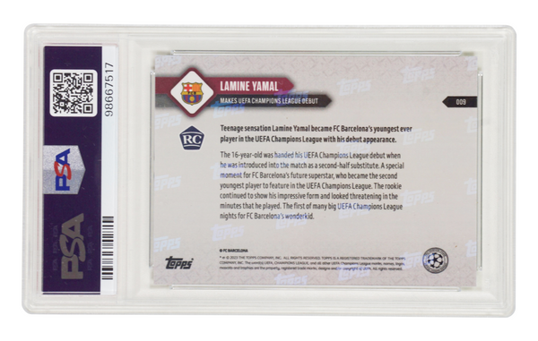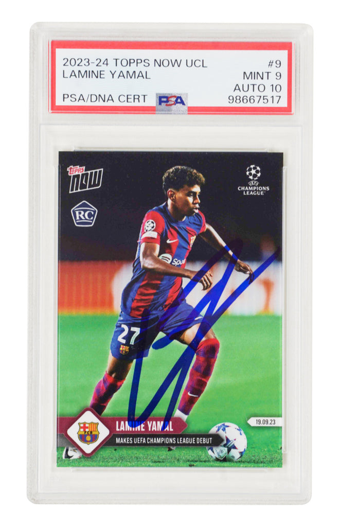 This is a Lamine Yamal Signed 2023-24 Topps Now UCL #9 Rookie Card - PSA 9 Autograph 10. THE ITEM IN THE PICTURE IS A STOCK IMAGE. YOU WILL RECEIVE AN IDENTICAL ITEM OF EQUAL QUALITY. ALL JERSEYS ARE SIZE LARGE. Every item of signed memorabilia we sell is official and of the highest quality. We pride ourselves on providing sports fans with the most exclusive signed memorabilia on the market. We are an industry leading signed memorabilia company who can guarantee 100% authenticity on every signature we sell. The item you receive will be identical to the one you are seeing in the stock pictures. This includes the item, the authentication company, signature color and signature placement. We take pride in ensuring the authenticity of all our items. With unwavering commitment, we guarantee that every signature is 100% authentic. Every item of signed memorabilia comes with a scannable barcode which takes you to the certificate of authenticity on the company's website. These industry leading authentication companies include Beckett Authentication Services, James Spencer Authentication Services and Professional Sports Authentication Services.