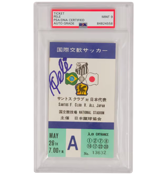 This is a Pele Signed 1972 May 26th Santos FC vs Japan Match Ticket - PSA 9 Autograph. THE ITEM IN THE PICTURE IS A STOCK IMAGE. YOU WILL RECEIVE AN IDENTICAL ITEM OF EQUAL QUALITY. ALL JERSEYS ARE SIZE LARGE. Every item of signed memorabilia we sell is official and of the highest quality. We pride ourselves on providing sports fans with the most exclusive signed memorabilia on the market. We are an industry leading signed memorabilia company who can guarantee 100% authenticity on every signature we sell. The item you receive will be identical to the one you are seeing in the stock pictures. This includes the item, the authentication company, signature color and signature placement. We take pride in ensuring the authenticity of all our items. With unwavering commitment, we guarantee that every signature is 100% authentic. Every item of signed memorabilia comes with a scannable barcode which takes you to the certificate of authenticity on the company's website. These industry leading authentication companies include Beckett Authentication Services, James Spencer Authentication Services and Professional Sports Authentication Services.