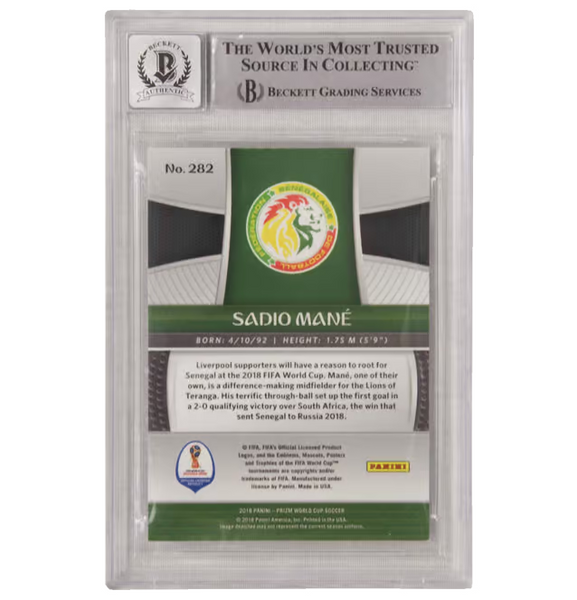 This is a Sadio Mane Signed 2018 Panini Prizm World Cup #282 - BGS 10 Autograph. THE ITEM IN THE PICTURE IS A STOCK IMAGE. YOU WILL RECEIVE AN IDENTICAL ITEM OF EQUAL QUALITY. ALL JERSEYS ARE SIZE LARGE. Every item of signed memorabilia we sell is official and of the highest quality. We pride ourselves on providing sports fans with the most exclusive signed memorabilia on the market. We are an industry leading signed memorabilia company who can guarantee 100% authenticity on every signature we sell. The item you receive will be identical to the one you are seeing in the stock pictures. This includes the item, the authentication company, signature color and signature placement. We take pride in ensuring the authenticity of all our items. With unwavering commitment, we guarantee that every signature is 100% authentic. Every item of signed memorabilia comes with a scannable barcode which takes you to the certificate of authenticity on the company's website. These industry leading authentication companies include Beckett Authentication Services, James Spencer Authentication Services and Professional Sports Authentication Services.