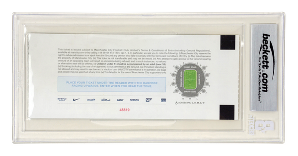 This is a Sergio Aguero Signed 2018 350th Career Goal Match Ticket Inscribed - BGS 5. THE ITEM IN THE PICTURE IS A STOCK IMAGE. YOU WILL RECEIVE AN IDENTICAL ITEM OF EQUAL QUALITY. ALL JERSEYS ARE SIZE LARGE. Every item of signed memorabilia we sell is official and of the highest quality. We pride ourselves on providing sports fans with the most exclusive signed memorabilia on the market. We are an industry leading signed memorabilia company who can guarantee 100% authenticity on every signature we sell. The item you receive will be identical to the one you are seeing in the stock pictures. This includes the item, the authentication company, signature color and signature placement. We take pride in ensuring the authenticity of all our items. With unwavering commitment, we guarantee that every signature is 100% authentic. Every item of signed memorabilia comes with a scannable barcode which takes you to the certificate of authenticity on the company's website. These industry leading authentication companies include Beckett Authentication Services, James Spencer Authentication Services and Professional Sports Authentication Services.