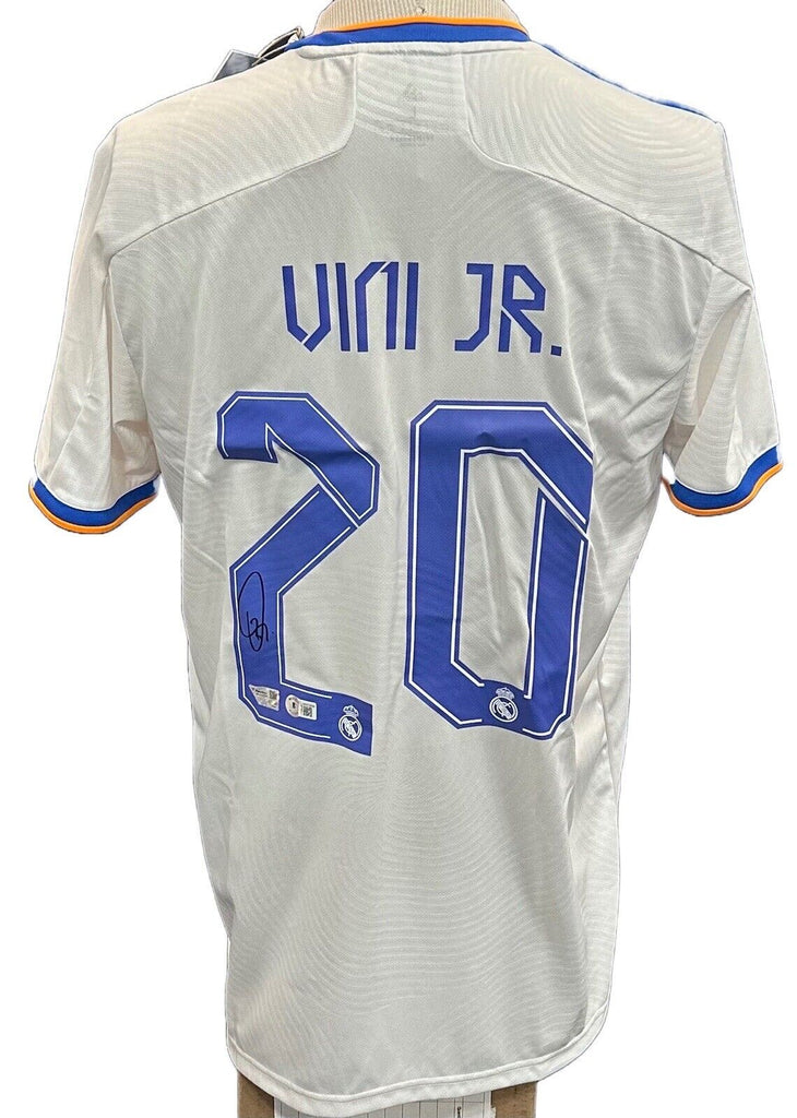 Vinicius Junior Signed Real Madrid White Adidas Jersey Autograph Fanatics BAS COA. Hand signed in bold black on the back of the jersey. Size Large Adidas White Real Madrid jersey of Real's star player Vinicius Junior. Comes with all original tags shown in photos. Beautiful white and blue jersey with Real Madrid stitched logo and Adidas logo.