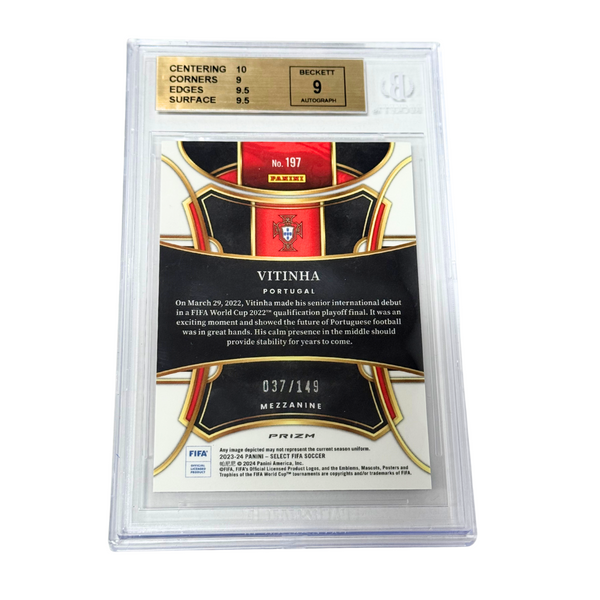 This is a Vitinha Signed 2023-24 Panini Select FIFA /149 Red Wave #197 - BGS 9.5. THE ITEM IN THE PICTURE IS A STOCK IMAGE. YOU WILL RECEIVE AN IDENTICAL ITEM OF EQUAL QUALITY. ALL JERSEYS ARE SIZE LARGE. Every item of signed memorabilia we sell is official and of the highest quality. We pride ourselves on providing sports fans with the most exclusive signed memorabilia on the market. We are an industry leading signed memorabilia company who can guarantee 100% authenticity on every signature we sell. The item you receive will be identical to the one you are seeing in the stock pictures. This includes the item, the authentication company, signature color and signature placement. We take pride in ensuring the authenticity of all our items. With unwavering commitment, we guarantee that every signature is 100% authentic. Every item of signed memorabilia comes with a scannable barcode which takes you to the certificate of authenticity on the company's website. These industry leading authentication companies include Beckett Authentication Services, James Spencer Authentication Services and Professional Sports Authentication Services.