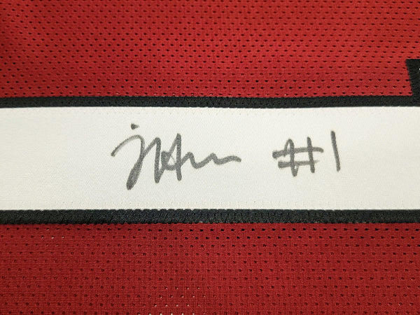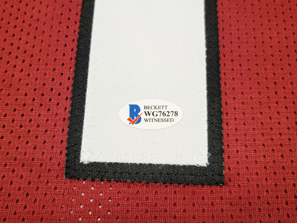 This is a Maroon Jersey that has been hand signed by Jaycee Horn. This is a custom jersey with no name brand. The approximate size is XL. It has nice sewn in name and numbers. This item has been witnessed and certified authentic by Beckett Authentication (BAS) and comes with their tamper-proof witness sticker. Beckett Authentication has recently changed their physical certificate card policy where they no longer match their tamper-proof sticker with a physical certificate. A certificate can be printed on Beckett's website for the matching authentication number.