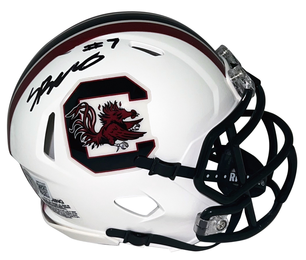 Spencer Rattler, star quarterback for the Gamecocks, has hand signed this South Carolina Riddell Speed mini helmet at a private signing. This item is authenticated by Beckett Authentication Services and was signed in the presence of one of their representatives. Their tamper-evident hologram featuring a QR code and serial number is on the item. The authenticity can be verified online by entering the serial number or scanning the QR code.Item pictured may not be the exact item you will receive. It will be similar quality, and we guarantee your satisfaction.