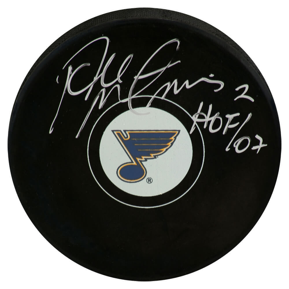 Al MacInnis signed St. Louis Blues logo hockey puck with 'HOF 07' inscription. Item comes with a Schwartz Sports Memorabilia tamper-proof numbered hologram and Certificate of Authenticity which can be verified online.